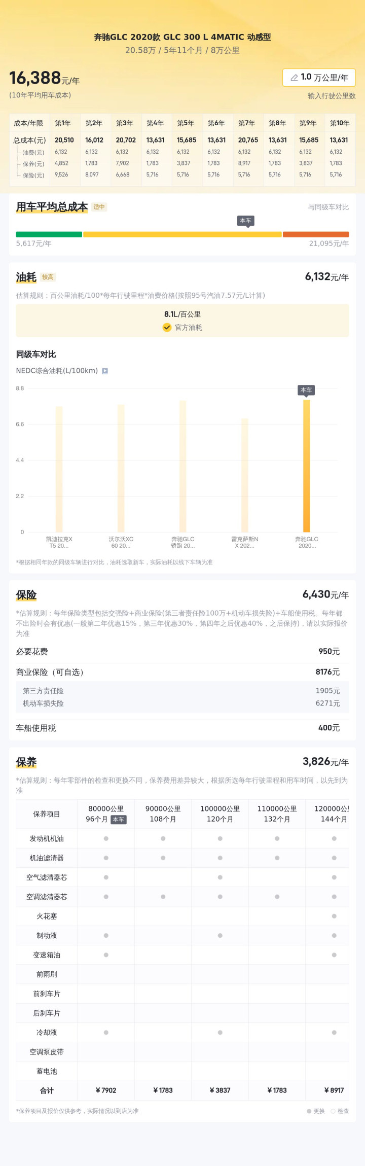 买车不是一阵子的事,往往一用好几年,所以用车成本也是大家买车之前要考虑清楚的,这辆车的百公里油耗为8.1升,每年的保养费用大约为4143元,保险费用大约为6367元,整体来看,六年的平均用车成本为16060元,在同级别车型里面处于较好地位。